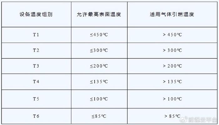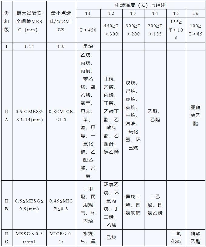要根據危險環境可能存在的可燃性氣體/蒸氣的種類來選擇防爆電氣設備的級別和溫度組別。電氣設備應按其最高表面溫度不超過可能出現的任何氣體或蒸氣的引燃溫度選型,電氣設備必須在被標志的溫度范圍內使用。