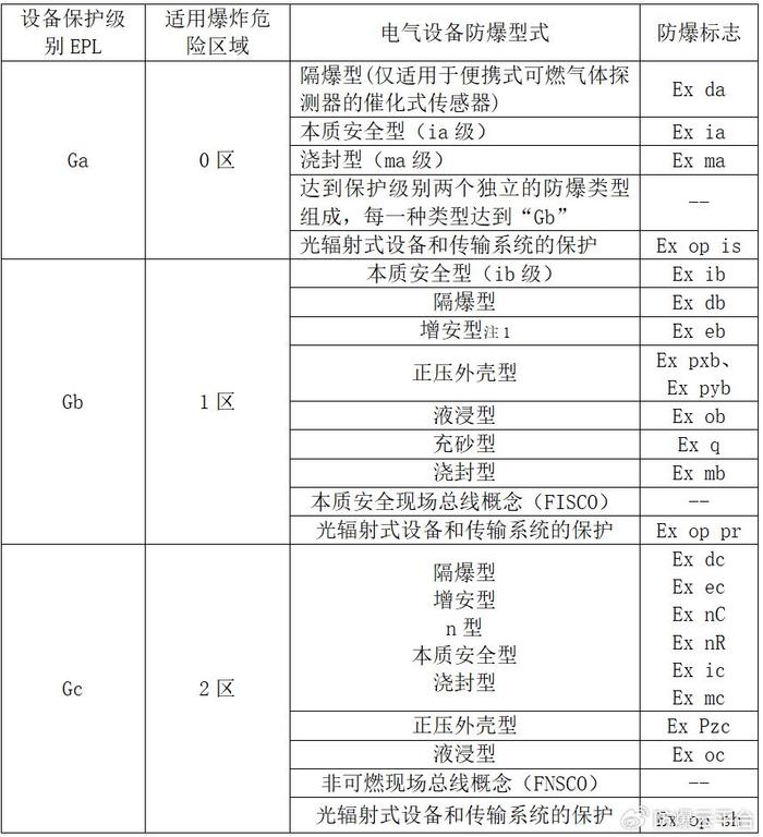 表1、根據爆炸危險區域選擇設備保護級別(EPL)和防爆結構